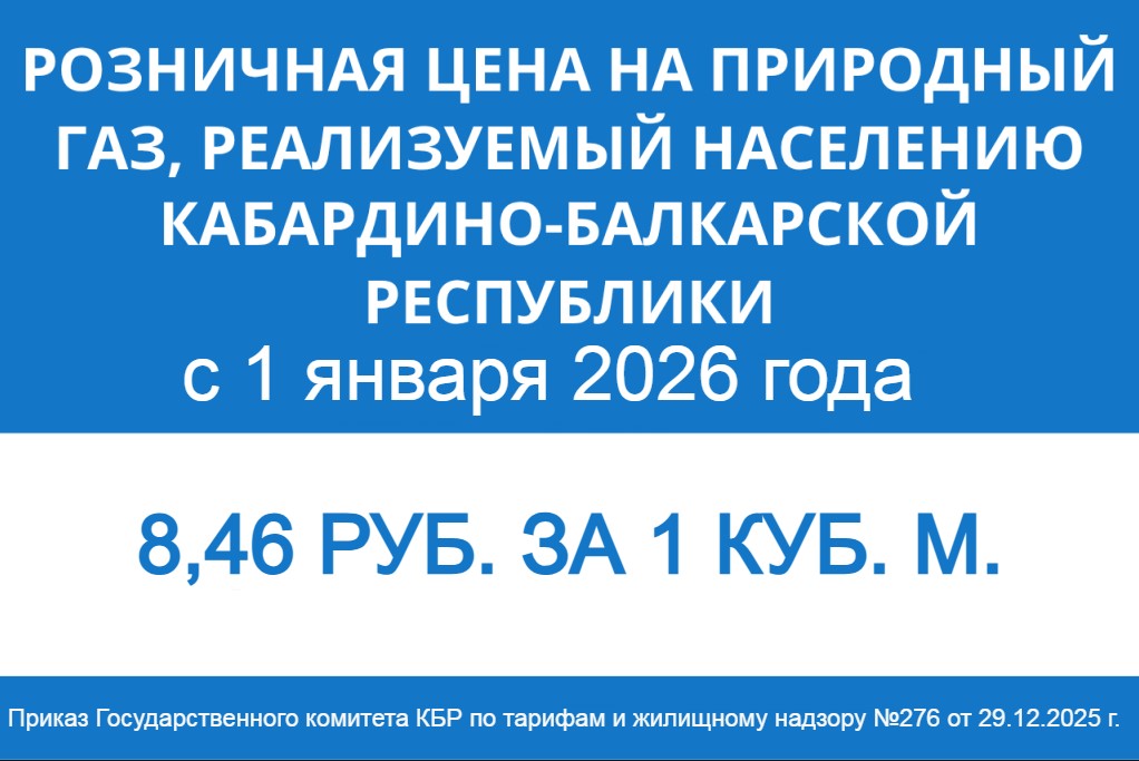 Государственным комитетом КБР по тарифам и жилищному надзору с 1 января 2026 года утверждена розничная цена на природный газ, реализуемый населению Кабардино-Балкарской Республики, в размере 8459 руб. 38 коп. за 1000 куб. м. (Приказ № 276 от 29.12.2025 г.)
