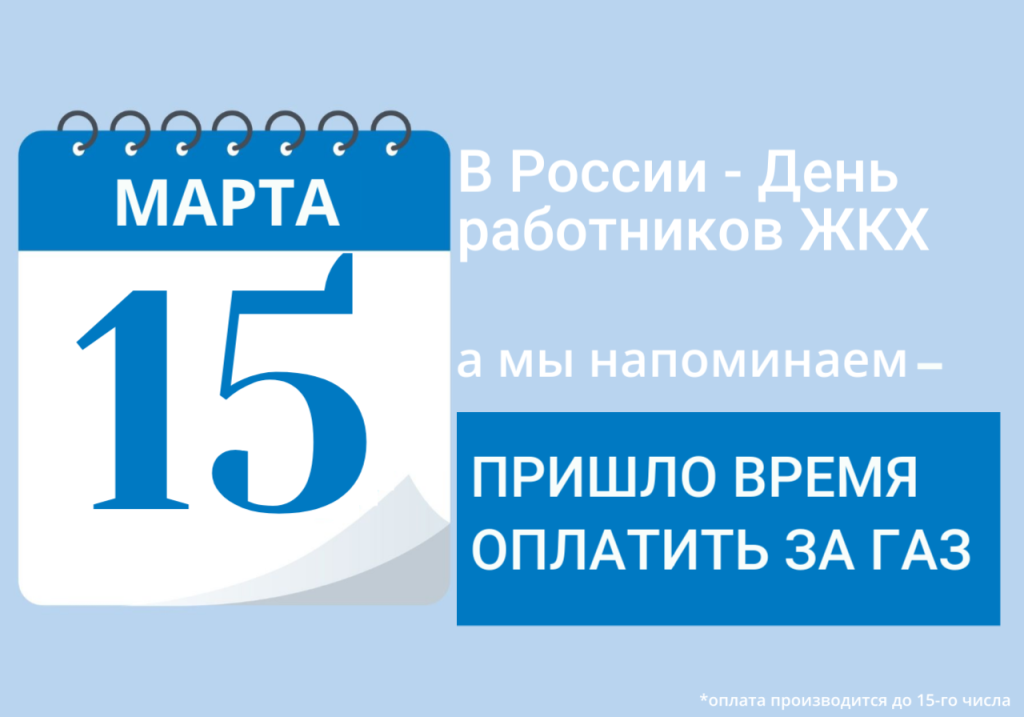 Уважаемые абоненты! Напоминаем о необходимости заплатить за потребленный в январе газ до 15 марта 2026 г. Согласно ст. 155 ЖК РФ, плата за потребленный газ осуществляется ежемесячно до 15-го числа месяца, следующего за истекшим расчетным периодом